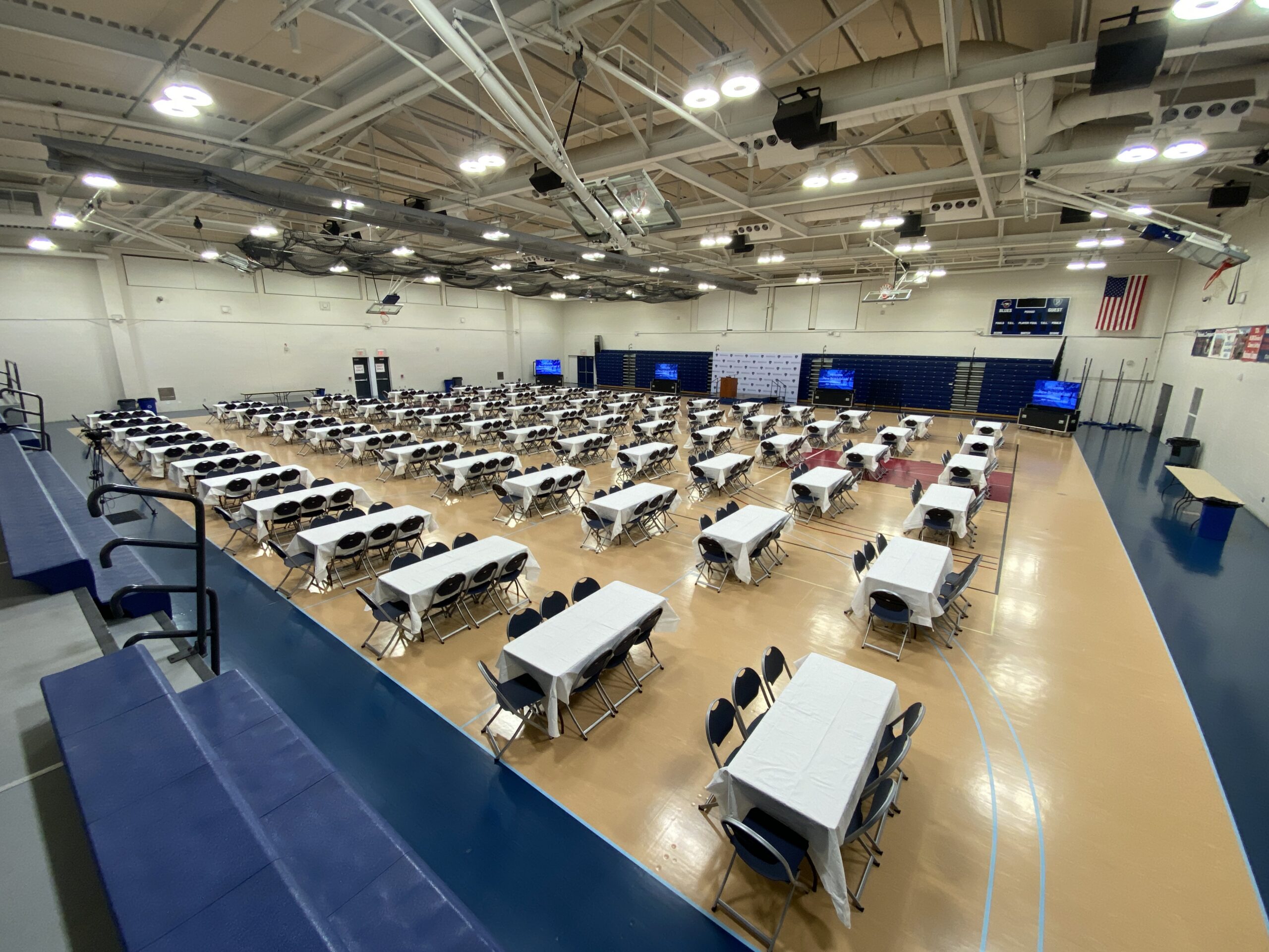 All three courts (main and two side courts when the divider is down) are regulation collegiate size. The gym floor is also lined for volleyball matches; posts for volleyball or tennis nets can be mounted in the gym floor on each court.