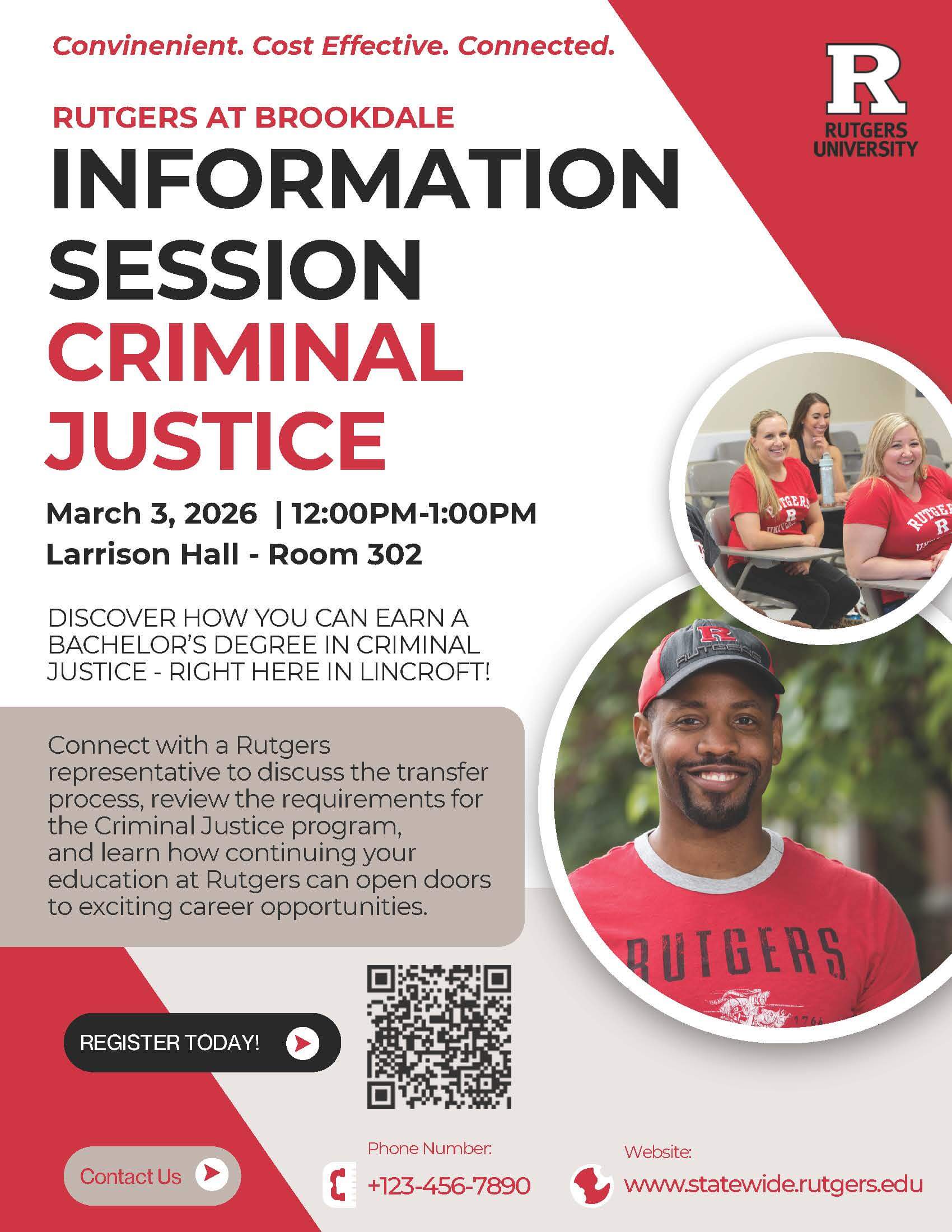 Discover how Rutgers at Brookdale offers a convenient and cost-effective way to earn a Rutgers degree close to home! This session will highlight the Criminal Justice program, clarify transfer guidelines, and explain the application process.