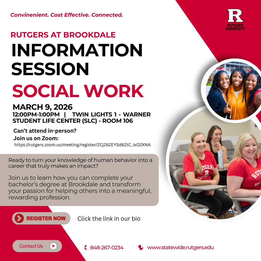 Discover how Rutgers at Brookdale offers a convenient and cost-effective way to earn a Rutgers degree close to home! This session will highlight the Social Work program, clarify transfer guidelines, and explain the application process.