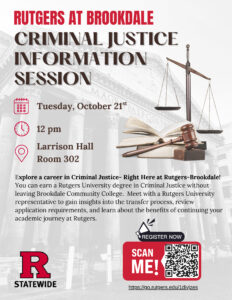 You can earn a Rutgers University degree in Criminal Justice without leaving Brookdale Community College. Meet with a Rutgers University representative to gain insights into the transfer process, review application requirements, and learn about the benefits of continuing your academic journey at Rutgers.