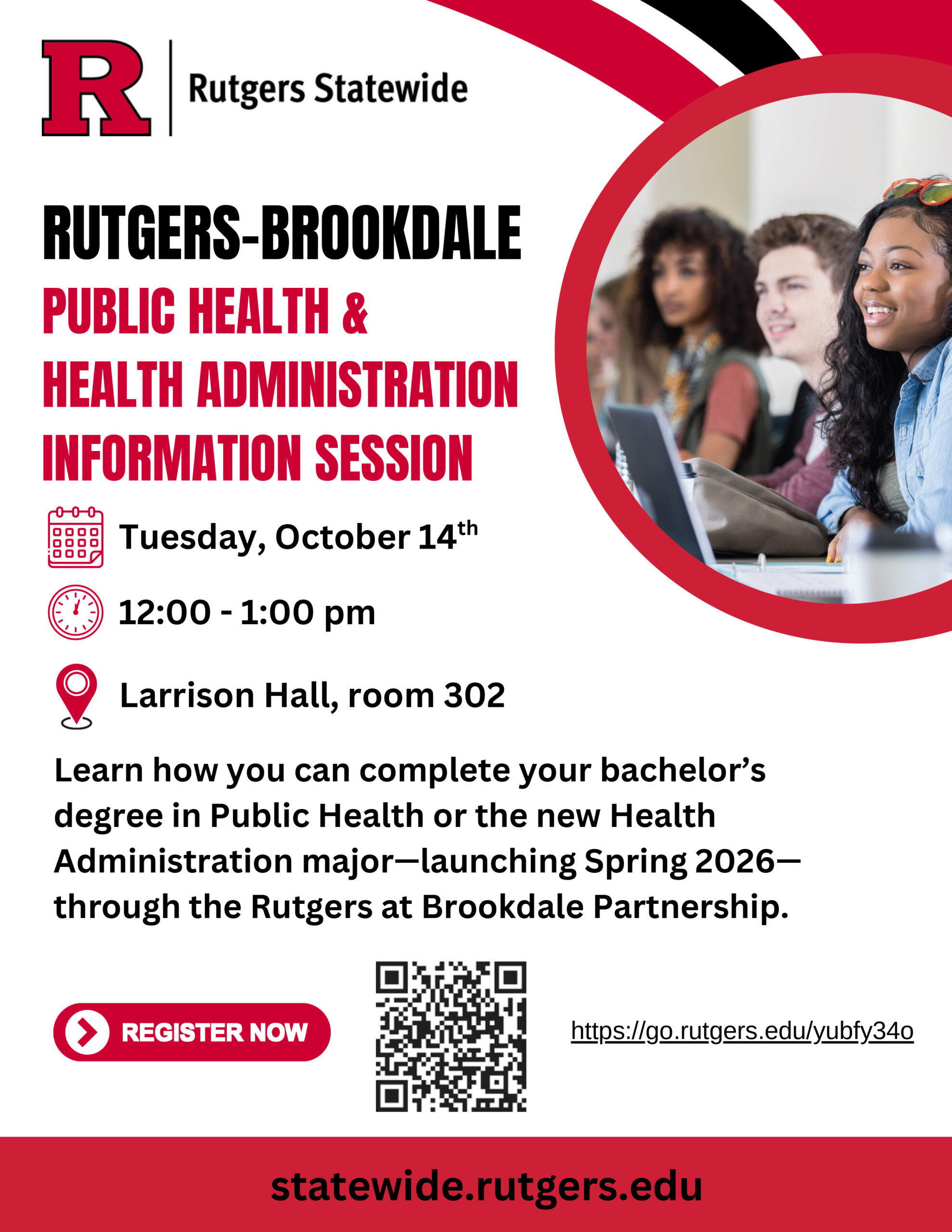 Discover how Rutgers at Brookdale offers a convenient and cost-effective way to earn a Rutgers degree close to home! Learn how you can complete your bachelor’s degree in Public Health or the new Health Administration major – launching Spring 2026 – through the Rutgers at Brookdale Partnership.